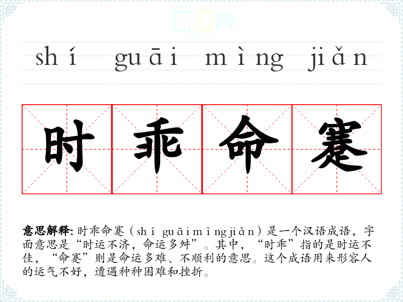 时乖命蹇(shí guāi mìng jiǎn)是一个汉语成语,字面意思是“时运不济,命运多舛”。其中,“时乖”指的是时运不佳,“命蹇”则是命运多难、不顺利的意思。这个成语用来形容人的运气不好,遭遇种种困难和挫折。
