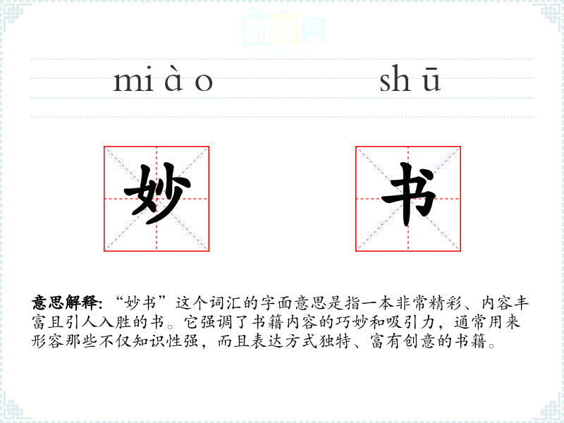 “妙书”这个词汇的字面意思是指一本非常精彩、内容丰富且引人入胜的书。它强调了书籍内容的巧妙和吸引力,通常用来形容那些不仅知识性强,而且表达方式独特、富有创意的书籍。