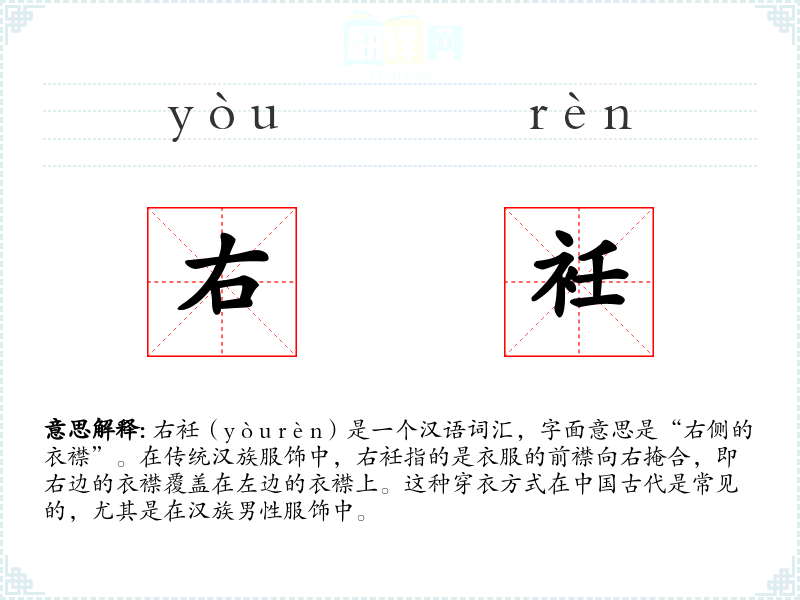 - 反义词:左衽(zuǒ rèn),即左边的衣襟覆盖在右边的衣襟上,这在某些少数民族服饰中较为常见。