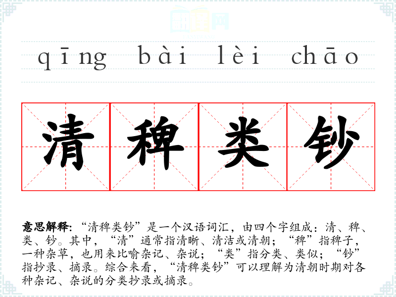 “清稗类钞”是一个汉语词汇,由四个字组成:清、稗、类、钞。其中,“清”通常指清晰、清洁或清朝;“稗”指稗子,一种杂草,也用来比喻杂记、杂说;“类”指分类、类似;“钞”指抄录、摘录。综合来看,“清稗类钞”可以理解为清朝时期对各种杂记、杂说的分类抄录或摘录。