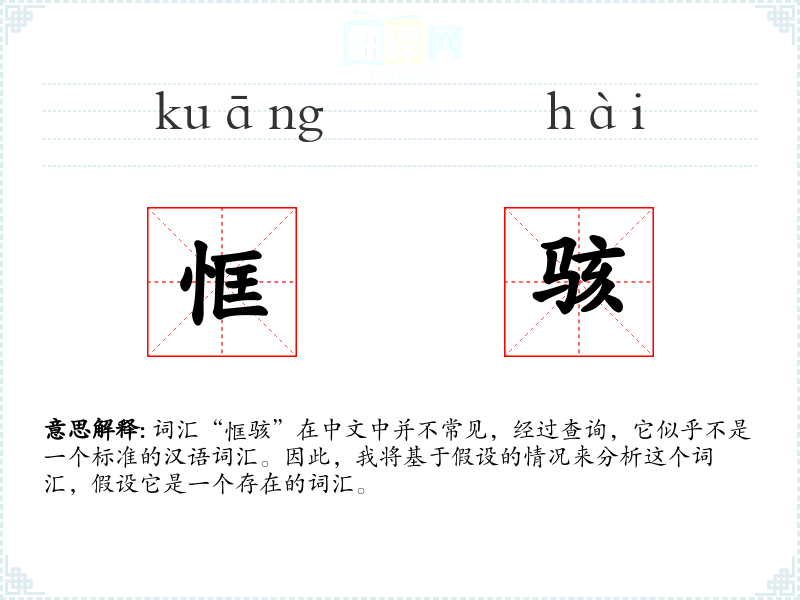 词汇“恇骇”在中文中并不常见,经过查询,它似乎不是一个标准的汉语词汇。因此,我将基于假设的情况来分析这个词汇,假设它是一个存在的词汇。