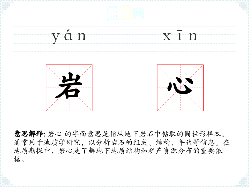 “岩心”一词由“岩”和“心”组成。“岩”指岩石,“心”指中心或核心。在地质学中,这个词的使用历史相对较短,随着地质勘探技术的发展而逐渐普及。