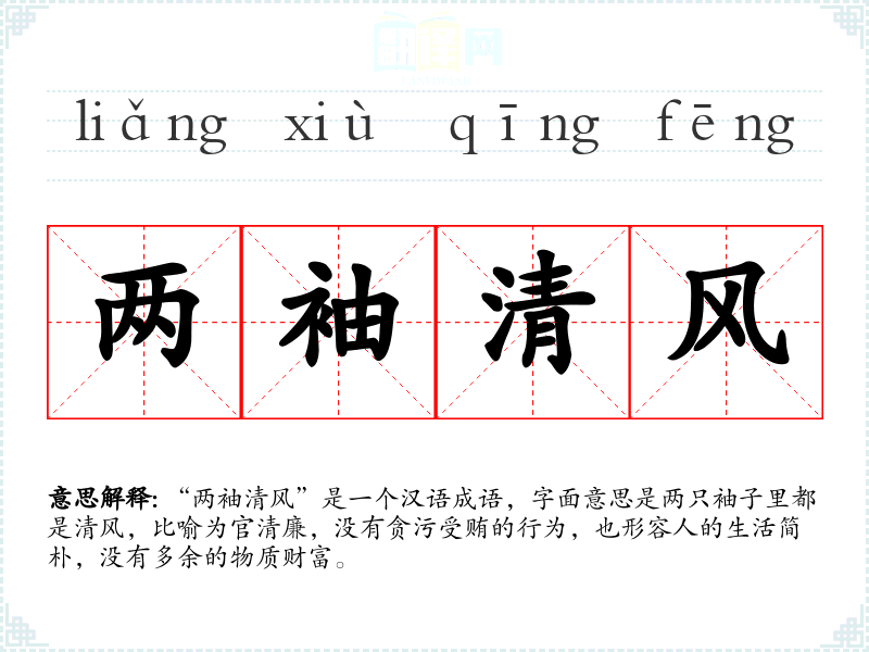 “两袖清风”是一个汉语成语,字面意思是两只袖子里都是清风,比喻为官清廉,没有贪污受贿的行为,也形容人的生活简朴,没有多余的物质财富。