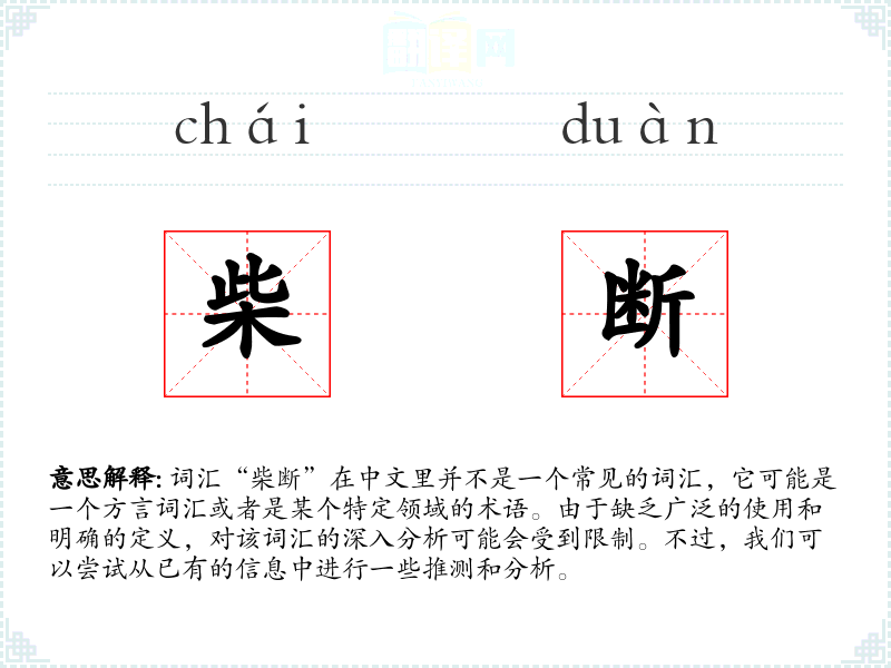 词汇“柴断”在中文里并不是一个常见的词汇,它可能是一个方言词汇或者是某个特定领域的术语。由于缺乏广泛的使用和明确的定义,对该词汇的深入分析可能会受到限制。不过,我们可以尝试从已有的信息中进行一些推测和分析。