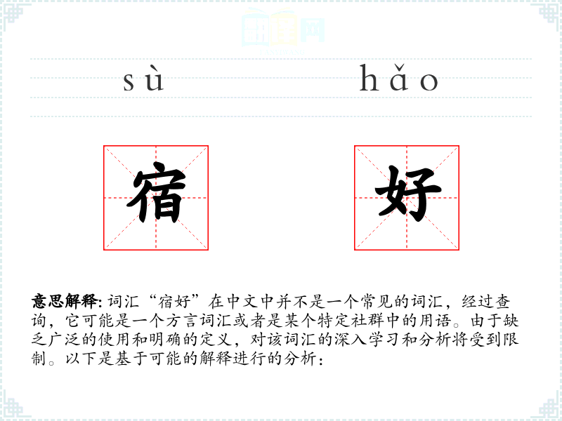 词汇“宿好”在中文中并不是一个常见的词汇,经过查询,它可能是一个方言词汇或者是某个特定社群中的用语。由于缺乏广泛的使用和明确的定义,对该词汇的深入学习和分析将受到限制。以下是基于可能的解释进行的分析:
