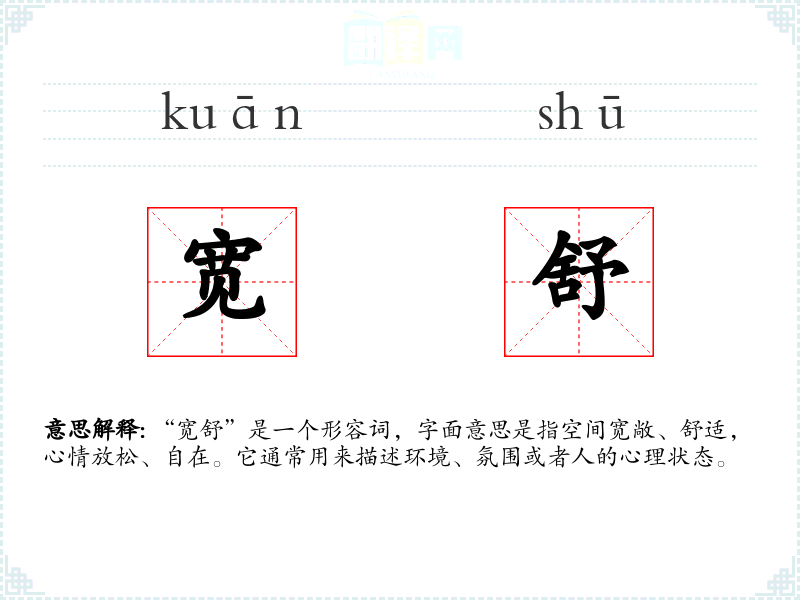 “宽舒”由“宽”和“舒”两个字组成,“宽”指空间大,“舒”指伸展、放松。这两个字结合在一起,形成了描述空间和心理状态的词汇。