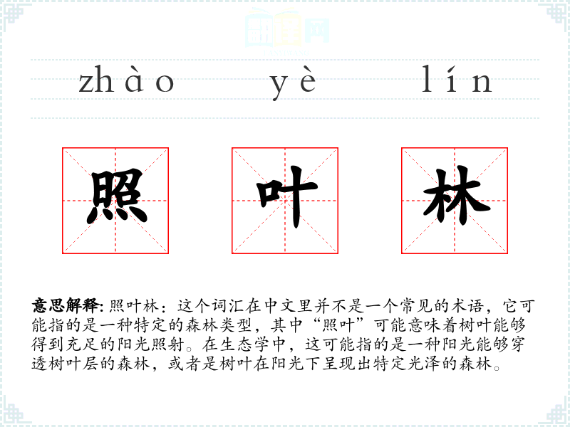 由于“照叶林”不是一个标准术语,它的词源和演变可能不明确。它可能是由“照”(照射)和“叶林”(树叶的森林)组合而成的新词。