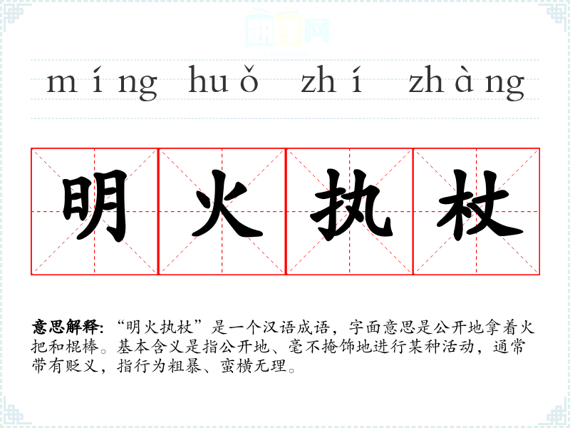 “明火执杖”是一个汉语成语,字面意思是公开地拿着火把和棍棒。基本含义是指公开地、毫不掩饰地进行某种活动,通常带有贬义,指行为粗暴、蛮横无理。