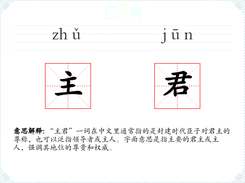 “主君”一词在中文里通常指的是封建时代臣子对君主的尊称,也可以泛指领导者或主人。字面意思是指主要的君主或主人,强调其地位的尊贵和权威。
