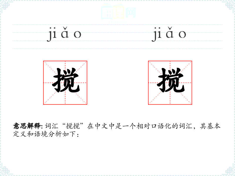 词汇“搅搅”在中文中是一个相对口语化的词汇,其基本定义和语境分析如下: