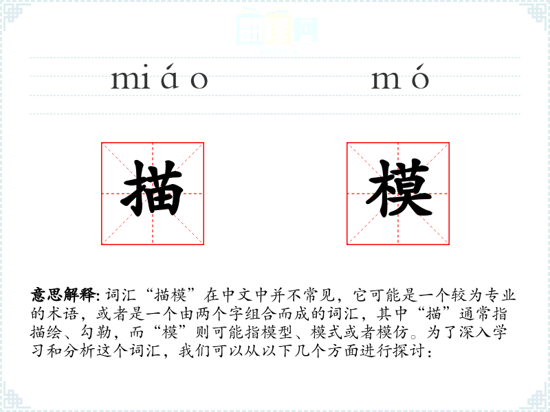 词汇“描模”在中文中并不常见,它可能是一个较为专业的术语,或者是一个由两个字组合而成的词汇,其中“描”通常指描绘、勾勒,而“模”则可能指模型、模式或者模仿。为了深入学习和分析这个词汇,我们可以从以下几个方面进行探讨: