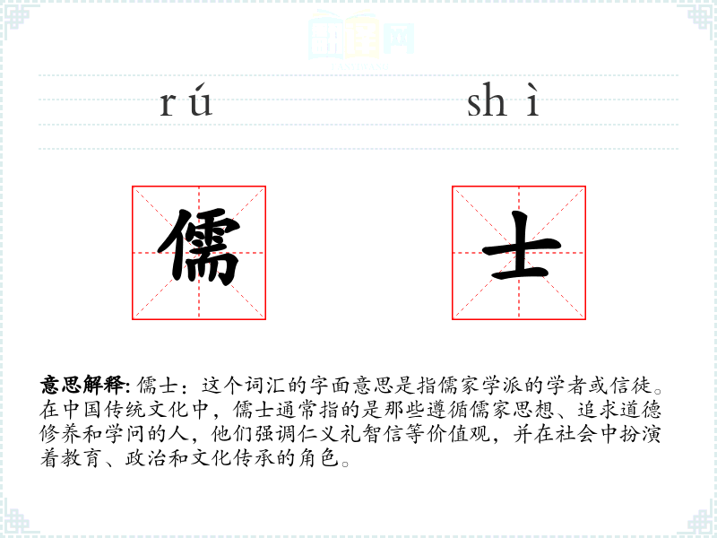 儒士:这个词汇的字面意思是指儒家学派的学者或信徒。在**传统文化中,儒士通常指的是那些遵循儒家思想、追求道德修养和学问的人,他们强调仁义礼智信等价值观,并在社会中扮演着教育、政治和文化传承的角色。