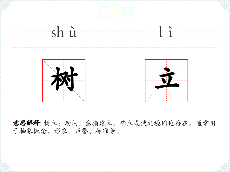 - 专业领域:在商业、教育等领域,“树立”可能用于描述建立品牌形象或学术标准。