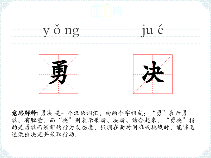 勇决 是一个汉语词汇,由两个字组成:“勇”表示勇敢、有胆量,而“决”则表示果断、决断。结合起来,“勇决”指的是勇敢而果断的行为或态度,强调在面对困难或挑战时,能够迅速做出决定并采取行动。