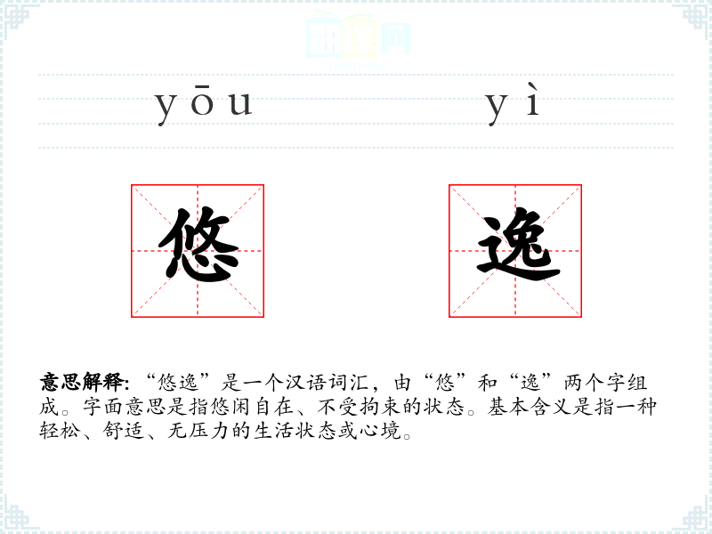 “悠逸”是一个汉语词汇,由“悠”和“逸”两个字组成。字面意思是指悠闲自在、不受拘束的状态。基本含义是指一种轻松、舒适、无压力的生活状态或心境。