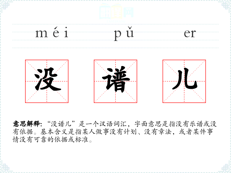 “没谱儿”是一个汉语词汇,字面意思是指没有乐谱或没有依据。基本含义是指某人做事没有计划、没有章法,或者某件事情没有可靠的依据或标准。
