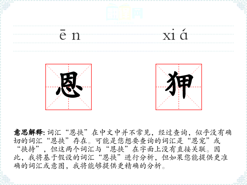词汇“恩挟”在中文中并不常见,经过查询,似乎没有确切的词汇“恩挟”存在。可能是您想要查询的词汇是“恩宠”或“挟持”,但这两个词汇与“恩挟”在字面上没有直接关联。因此,我将基于假设的词汇“恩挟”进行分析,但如果您能提供更准确的词汇或意图,我将能够提供更精确的分析。