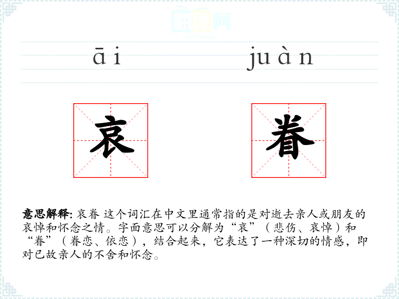 哀眷 这个词汇在中文里通常指的是对逝去亲人或朋友的哀悼和怀念之情。字面意思可以分解为“哀”(悲伤、哀悼)和“眷”(眷恋、依恋),结合起来,它表达了一种深切的情感,即对已故亲人的不舍和怀念。