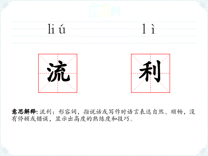 流利:形容词,指说话或写作时语言表达自然、顺畅,没有停顿或错误,显示出高度的熟练度和技巧。