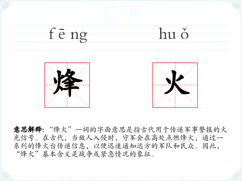 “烽火”一词的字面意思是指古代用于传递军事警报的火光信号。在古代,当敌人入侵时,守军会在高处点燃烽火,通过一系列的烽火台传递信息,以便迅速通知远方的军队和民众。因此,“烽火”基本含义是战争或紧急情况的象征。