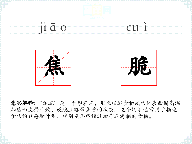 “焦脆”是一个形容词,用来描述食物或物体表面因高温加热而变得干燥、硬脆且略带焦黄的状态。这个词汇通常用于描述食物的口感和外观,特别是那些经过油炸或烤制的食物。