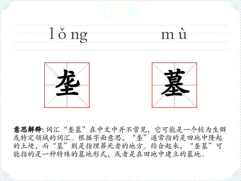 - 词源:“垄”和“墓”都是古代汉语词汇,分别指田地中的土埂和埋葬死者的地方。