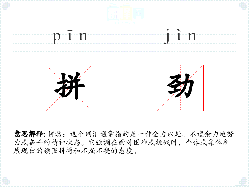 拼劲一词源于汉语,由“拼”和“劲”两个字组成。拼字有拼凑、拼合之意,劲字则指力量、精力。两者结合,形成了强调全力以赴、不遗余力的含义。