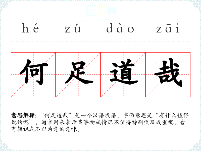 - 文学:在文学作品中,“何足道哉”常用于表达对某人或某事的轻蔑或不屑,如在古典小说中描述一些微不足道的小人物或小事时。