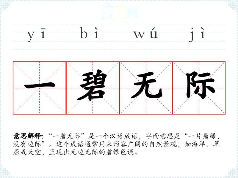 - 文学:在文学作品中,“一碧无际”常用来描绘壮丽的自然景色,增强作品的意境和美感。例如,古代诗人在描述草原或海洋时可能会使用这个成语。