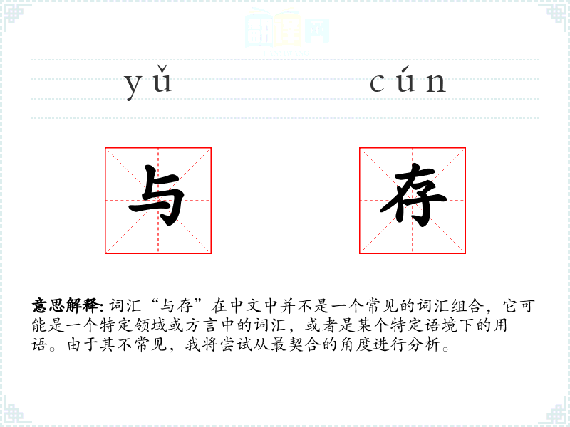 由于“与存”不是一个标准词汇,我们无法给出确切的基本定义。它可能是由“与”和“存”两个字组合而成的,其中“与”可以表示“和”、“跟”等意思,而“存”则表示“存在”、“保存”等意思。