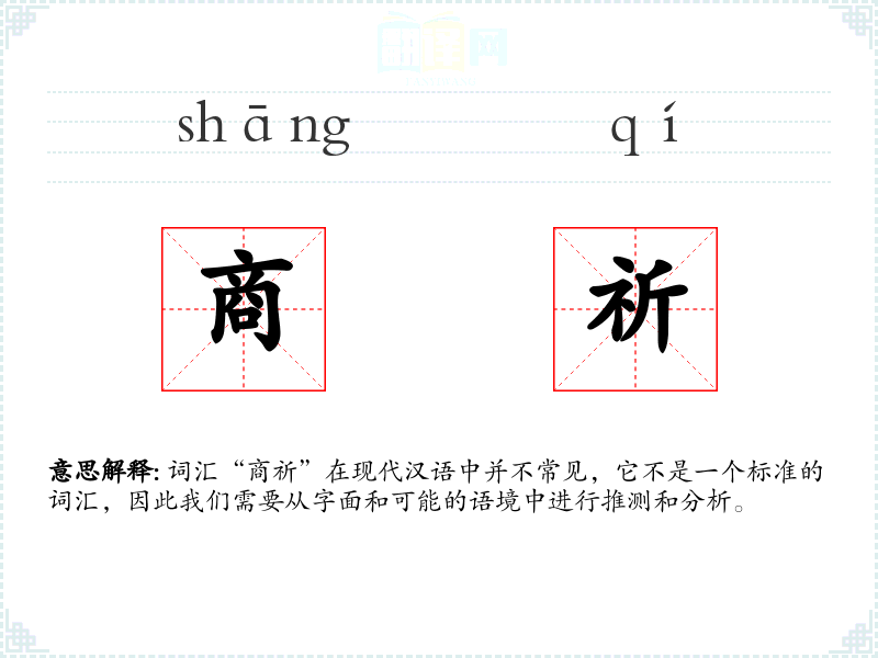 词汇“商祈”在现代汉语中并不常见,它不是一个标准的词汇,因此我们需要从字面和可能的语境中进行推测和分析。