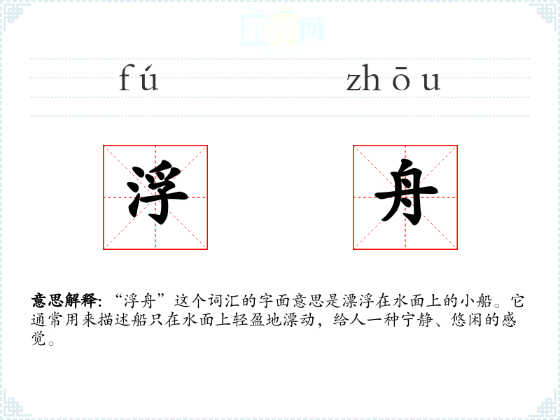 “浮舟”这个词汇的字面意思是漂浮在水面上的小船。它通常用来描述船只在水面上轻盈地漂动,给人一种宁静、悠闲的感觉。