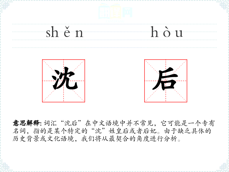由于“沈后”是一个较为特定的称谓,其词源可能直接来源于中国历史中的某个具体人物。在语言演变中,这种称谓通常保持其原有的意义和用法。