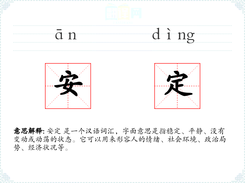“安定”一词的词源较为直接,由“安”和“定”两个字组成,“安”意味着安全、平静,“定”意味着固定、不变。在古代汉语中,“安定”就已经是一个常用词汇,用来描述稳定的状态。