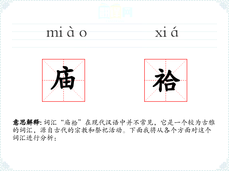 词汇“庙祫”在现代汉语中并不常见,它是一个较为古雅的词汇,源自古代的**和祭祀活动。下面我将从各个方面对这个词汇进行分析: