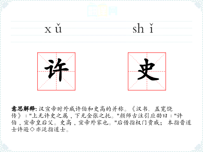 汉宣帝时外戚许伯和史高的并称。《汉书.盖宽饶传》﹕"上无许史之属﹐下无金张之托。"颜师古注引应劭曰﹕"许伯﹐宣帝皇后父。史高﹐宣帝外家也。"后借指权门贵戚; 本指晋道士许逊◇亦泛指道士。