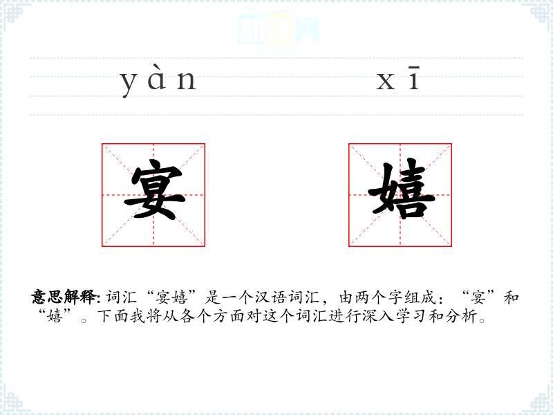 词汇“宴嬉”是一个汉语词汇,由两个字组成:“宴”和“嬉”。下面我将从各个方面对这个词汇进行深入学*和分析。