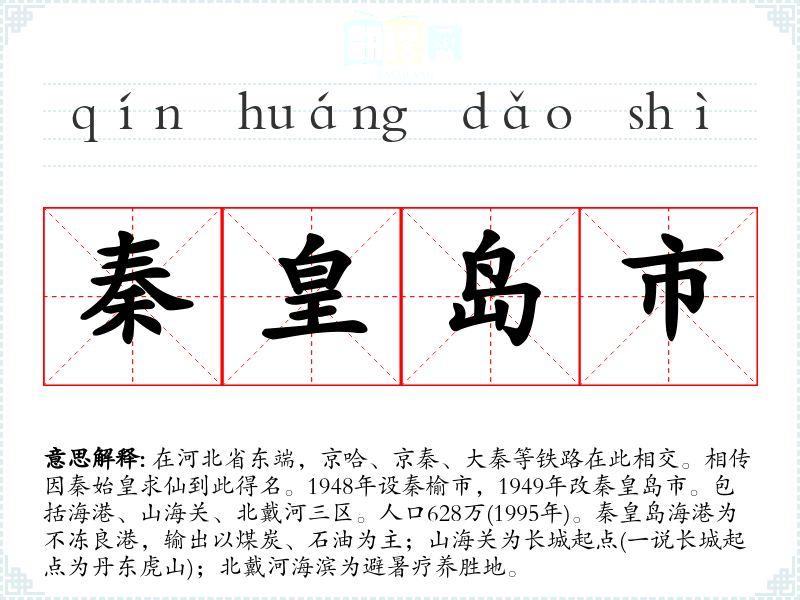 1.在河北省东端,京哈、京秦、大秦等铁路在此相交。相传因秦始皇求仙到此得名。1948年设秦榆市,1949年改秦皇岛市。包括海港、山海关、北戴河三区。人口628万(1995年)。秦皇岛海港为不冻良港,输出以煤炭、石油为主;山海关为长城起点(一说长城起点为丹东虎山);北戴河海滨为避暑疗养胜地。