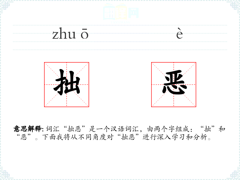 “拙”字古汉语中指笨拙、不灵巧,“恶”字则指不好、恶劣。两个字组合起来,强调了不仅技术上的不足,还有道德或审美上的负面评价。