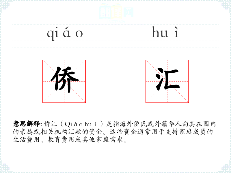侨汇(Qiáo huì)是指海外侨民或外籍华人向其在国内的亲属或相关机构汇款的资金。这些资金通常用于支持家庭成员的生活费用、教育费用或其他家庭需求。