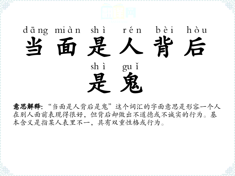 “当面是人背后是鬼”这个词汇的字面意思是形容一个人在别人面前表现得很好,但背后却做出不道德或不诚实的行为。基本含义是指某人表里不一,具有双重性格或行为。