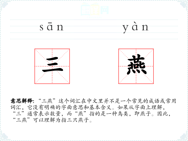 - 反义词:无(因为“三燕”不是一个常用词汇,没有明确的反义词)