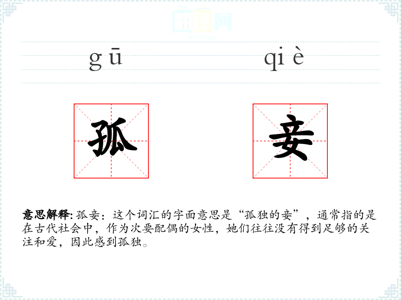 孤妾:这个词汇的字面意思是“孤独的妾”,通常指的是在古代社会中,作为次要配偶的女性,她们往往没有得到足够的关注和爱,因此感到孤独。