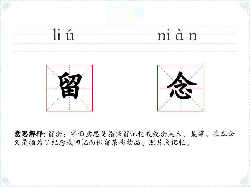 留念:字面意思是指保留记忆或纪念某人、某事。基本含义是指为了纪念或回忆而保留某些物品、照片或记忆。