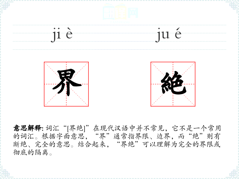 词汇“[界绝]”在现代汉语中并不常见,它不是一个常用的词汇。根据字面意思,“界”通常指界限、边界,而“绝”则有断绝、完全的意思。结合起来,“界绝”可以理解为完全的界限或彻底的隔离。