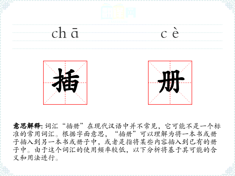 词汇“插册”在现代汉语中并不常见,它可能不是一个标准的常用词汇。根据字面意思,“插册”可以理解为将一本书或册子插入到另一本书或册子中,或者是指将某些内容插入到已有的册子中。由于这个词汇的使用频率较低,以下分析将基于其可能的含义和用法进行。