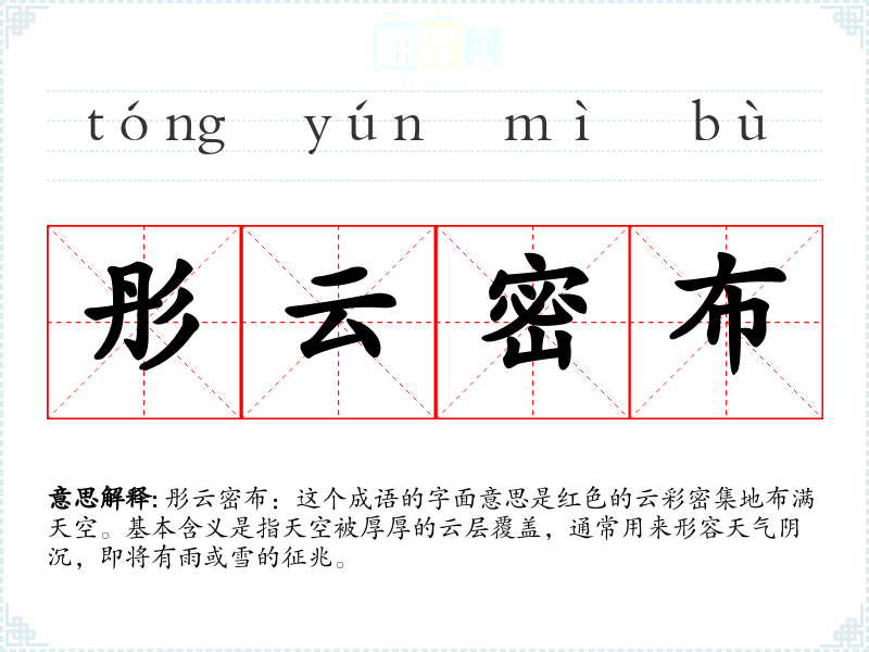 彤云密布:这个成语的字面意思是红色的云彩密集地布满天空。基本含义是指天空被厚厚的云层覆盖,通常用来形容天气阴沉,即将有雨或雪的征兆。
