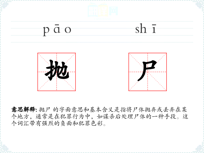 抛尸 的字面意思和基本含义是指将尸体抛弃或丢弃在某个地方,通常是在犯罪行为中,如谋杀后处理尸体的一种手段。这个词汇带有强烈的负面和犯罪色彩。