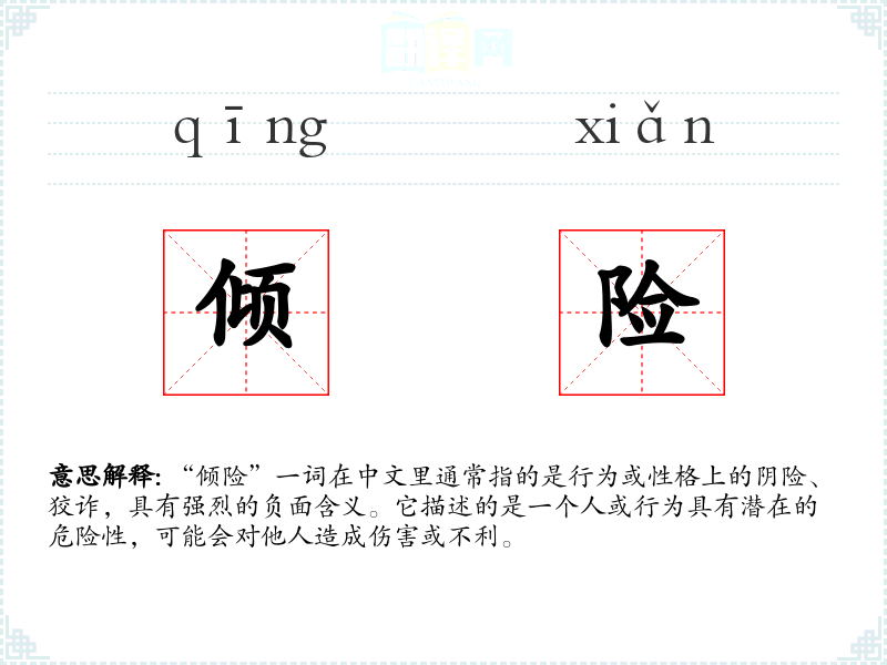 “倾险”一词在中文里通常指的是行为或性格上的阴险、狡诈,具有强烈的负面含义。它描述的是一个人或行为具有潜在的危险性,可能会对他人造成伤害或不利。