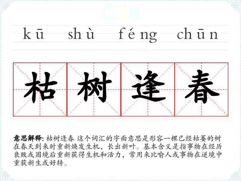 枯树逢春 这个词汇的字面意思是形容一棵已经枯萎的树在春天到来时重新焕发生机,长出新叶。基本含义是指事物在经历衰败或困境后重新获得生机和活力,常用来比喻人或事物在逆境中重获新生或好转。